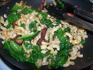 I pulled the pieces out of the pan, drained them on a paper towl to get rid of excess fat and poured 98% of the leftover fat down the drain. I left the remainging grease in the pan and added the chopped garlic. Once that cooked through, I added the apple, a little salt and pepper, and then the pasta. Then I started slowly folding in the large leafs of spinach. Once it had wilted nicely, I added back in the bits of bacon and the walnuts and mixed it all together. A little sprinkle of Parmesan cheese over the top-and it was done.Now granted, the bacon probably killed all nutritional value of the dish, but wow was this good. The smoky flavor from the bacon traveled throughout the dish, and was just broken up by the quick bursts of sweet apple. The spinach was as gorgeous as I though it would be, and the walnuts went really well with the pasta. Needless to say, this was a huge hit, and really did "hit the spot" as well after a long day!