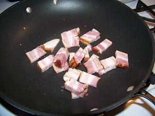 Calcium, but with the same white flour taste as regular pasta, this was sure to be a hit. I also picked up a small container of walnuts (loaded in omega-3s), a nice green Granny Smith apple, thick cut bacon (no nutritional value whatsoever I know) and a small block of parmesan cheese for grating.Back at home I first toasted a handful and a half of the walnuts, just to get their juices flowing. I set about a 1/4 of the box of pasta boiling in salted water. Then I chopped three small cloves of garlic, half the apple, and two slices of the bacon. After removing the walnuts from the pan, I set them aside and added the bacon to the same pan and let it do its thing and get nice and crispy. While that was going on, the pasta had reached its al dente state, and so I drained it quickly, and put it aside. When the bacon was done,