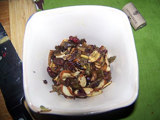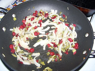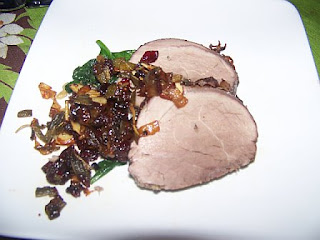 Once the pork was cooked, I drained off the excess fat in the pan, and then I added the chopped tomato. Finally, I added maybe just about a 1/4 of a cup of orange juice to the pan as well. I allowed that cook down a bit, and then added several handfuls of baby spinach to the mixture. Then, just as I was about to pull it off the heat, I tossed in a handful of chopped green pepper. Stirred to get them warm, and then pulled it from the heat before they lost their crunch.