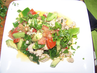 So I got to the store last night, and started picking up what looked good- an avocado, some beautiful vine ripened tomatoes, a red chili pepper- the name escapes me but it was touted as hotter than a Jalapeno, and they were out of my usual Serrano peppers, cilantro, a green bell pepper....and then I walked to the meat section. They were out of ground chicken. I was utterly confused. I stood holding my produce...and then I spied ground pork. Not quite the same-but it might work. Finally, I picked up some Orange Juice and checked out.