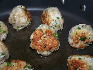 As I waited for that to cool so that I could start in on the soup, I turned my attention to the turkey meatballs I wanted to add into the soup. I love the idea of adding some sort of good protein to soups and stews as it just can make them so hearty and filling. Turkey meat is always a great alternative as well- not only does it have all that great nutritional protein, but its super lean (especially breast meat) and therefore doesn't contribute unnecessary fat to an other wise healthy meal. I chopped up just a couple of slices of onion, a bit more rosemary, and parsley and then combined that with a mixture of bread crumbs and crushed water crackers as well for texture, poultry seasoning and more crushed red pepper flakes- just a few. Then I added in just a bit over a pound of ground white breast turkey meat, and one egg. Once all was mixed together, I formed small balls and then
