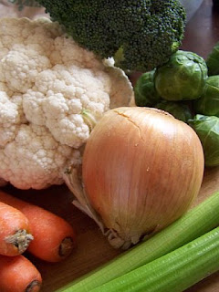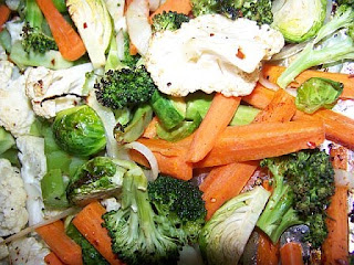 Yesterday, I envisioned a big pot of roasted vegetable soup-chock full of nutritious vegetables, and some turkey meatballs for some added protein. Off to the grocery store I went, and picked up loads of fresh veggies- Brussel Sprouts, cauliflower, broccoli, carrots, onions, celery, spinach, a couple ears of corn and cherry tomatoes. I also picked up two cans of beans- black and Cannelloni, as well as a box of vegetable stock- I know "lazy". Back at home I went to work breaking down all the veggies- I cleaned up and sliced the Brussel Sprouts into quarters, cut down the broccoli and cauliflower into manageable pieces, the same with the carrots and the celery, and then I sliced half the onion into rings. I laid all of them out on a flat baking sheet, and then tossed with olive oil, salt, pepper, crushed red pepper flakes and chopped