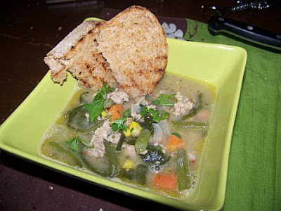 chopping some green beans into bite sized pieces, adding them to the soup, adding some frozen corn kernels to the mix, and then finally adding in a few big handfuls of baby spinach leaves. A stir around the pot, a simmer for a few minutes, and I began my own taste testing. Apparently the Serrano pepper did not contain enough heat-so a few drops of hot sauce went in, a bit more salt, and then another maybe three ounces of the beer, and the soup was ready to simmer for about a half hour, forty five minutes before I could spoon myself out a nice bowl for dinner.This soup is delicious. My original picture had been of a thicker stew type meal, but this has a beautiful velvety smooth broth to it- beefed up with beans and a nice earthy flavor. The pumpkin from the beer is a nice background taste of fall- though the pumpkin flavor is indiscernible. The chicken/pork combination breaks up the broth-though it would be fine on its own, and the veggies are a love texture variation and boot of vitamins. I ate it with a quickly grilled slice of the whole wheat bread and it was a meal fit for a king- or at least- an exhausted girl after a busy day!