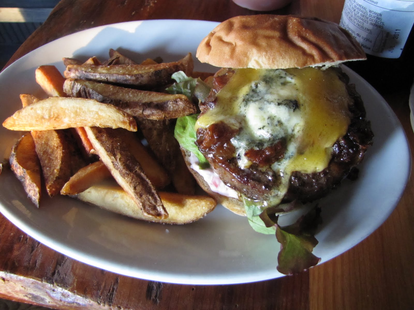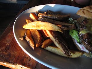 John's burger was just as tasty. 8 ounces of ground chuck, grilled perfectly, topped with Cotswold cheese and a bacon and onion marmalade-it had tremendous flavor. And if this is any high praise- John loved it -onions and all! The chips served with it were thick cut but each crispy and delicious, and when paired with the house made ketchup or malt vinegar-truly delicious.