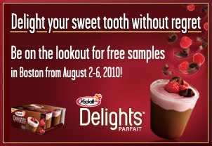 First off, between August 2 and August 6 Yoplait Delight Parfait samples will be handed out to those lucky commuters at those high foot traffic areas around town. So just imagine, your walking through the Common, or weaving your way through Downtown Crossing, or perhaps rushing off the T and there, like a mirage in the dessert, is a friendly face offering you a delicious treat. Doesn't that sound like a wonderful mid-summer delight??