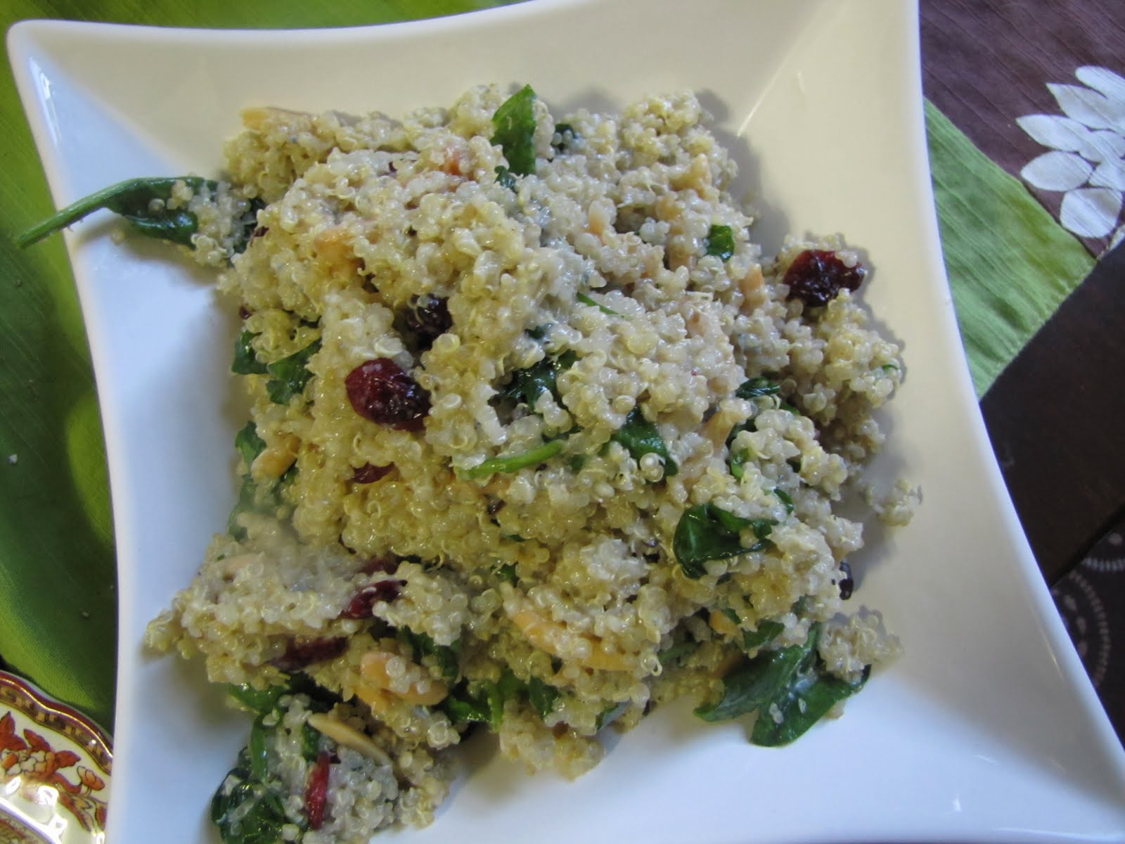 Of course, I had to jazz up the Quinoa a little right? When it was finished cooking, I crumbled about half a medium size wedge of Gorgonzola cheese into a bowl, and then added the Quinoa on top. I stirred to combined and ended up with Gorgonzola Quinoa-yum. Then I added a few handfuls of baby spinach to the mix, along with a hand full or two of slivered almonds, the same of dried cranberries, a teaspoon of garlic powder, and a little salt and pepper. A quick stir in the bowl and the spinach wilted, and then it was done. It looked gorgeous, and it smelled delicious.