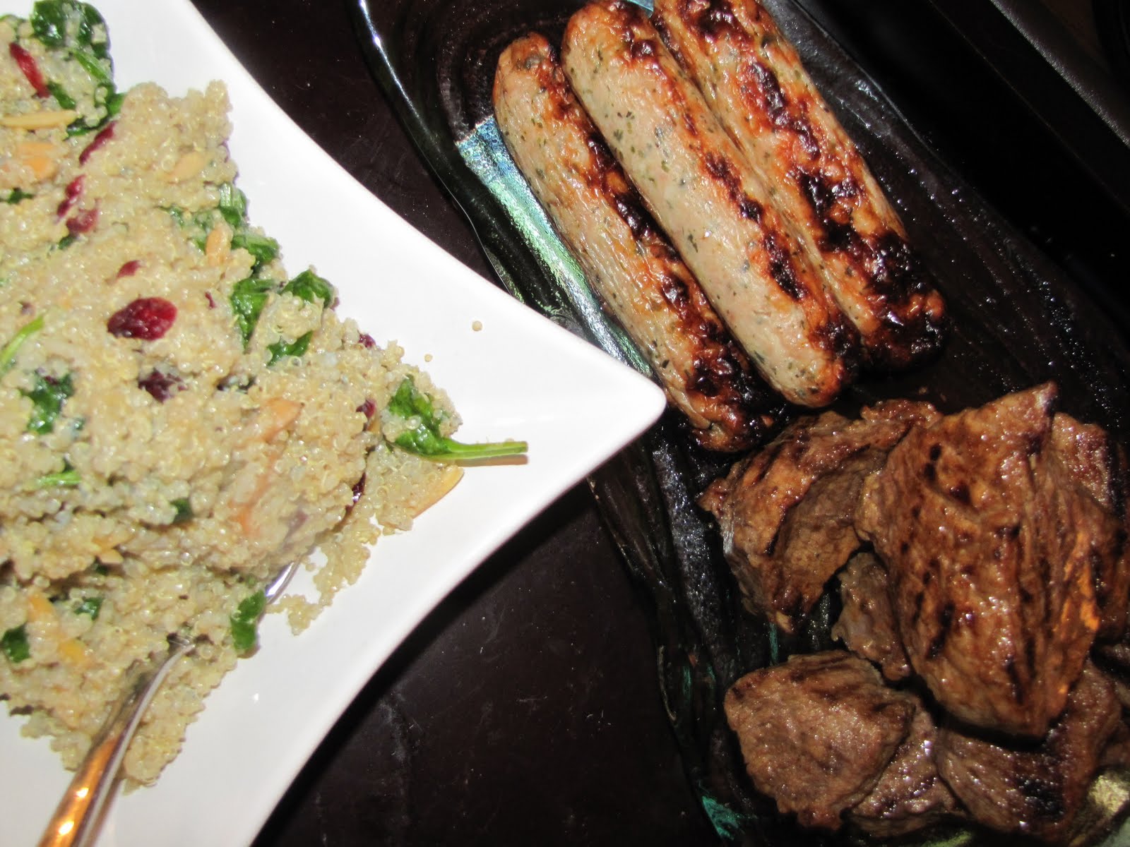 A few evenings ago, John's friend Paul stopped by the apartment to pay us a visit. Paul and his wonderful wife Meaghan are some of John's dearest friends, and people I adore as well. I won't even start to go on about how much I love their baby daughter...Needless to say, as soon as I heard that Paul would be by after work, I immediately started planning what I could make for dinner for us, should he have time to stay, that would be simple so I could continue enjoying the company, delicious, and elegant. I am still rather obsessed with Quinoa, so I decided to make a nice Quinoa salad, and since John and I were "fished out" from our trip to Portland, I thought some steak tips might also be nice. At the last minute, worried that I didn't have enough, I threw some Garlic Chicken Sausage in the cart as well-just in case.