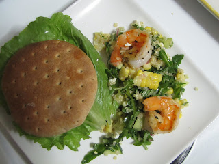 Now, I have had Quinoa before, in restaurants, but having never cooked it before, I wasn't entirely sure what to expect. I decided to make a chilled salad, containing all of those light summer ingredients- sweet corn, lemon, shrimp, even some arugula. I started by boiling the Quinoa in two cups of chicken stock to add some extra flavor to it. The recipe said two cups of water- but thought-why not amp it up some? I'm sure though it would be tasty with just water as well. At the same time, in a separate pot, I boiled up three ears of fresh corn as well. Once it was all done cooking, I just strained the Quinoa-which is actually a seed-, removed the corn from the water, and set everything aside to cool. Then, I lightly salted and peppered some beautiful fresh shrimp and then grilled them on my stove top grill pan. So far- this was an easy-peasy meal.