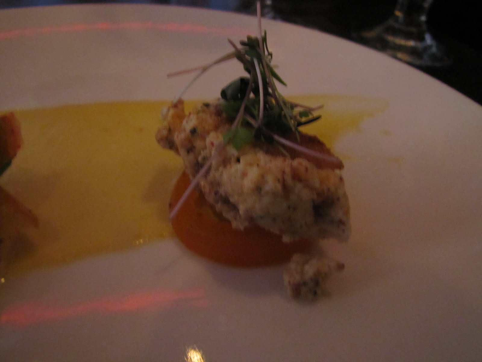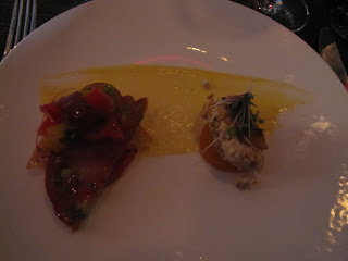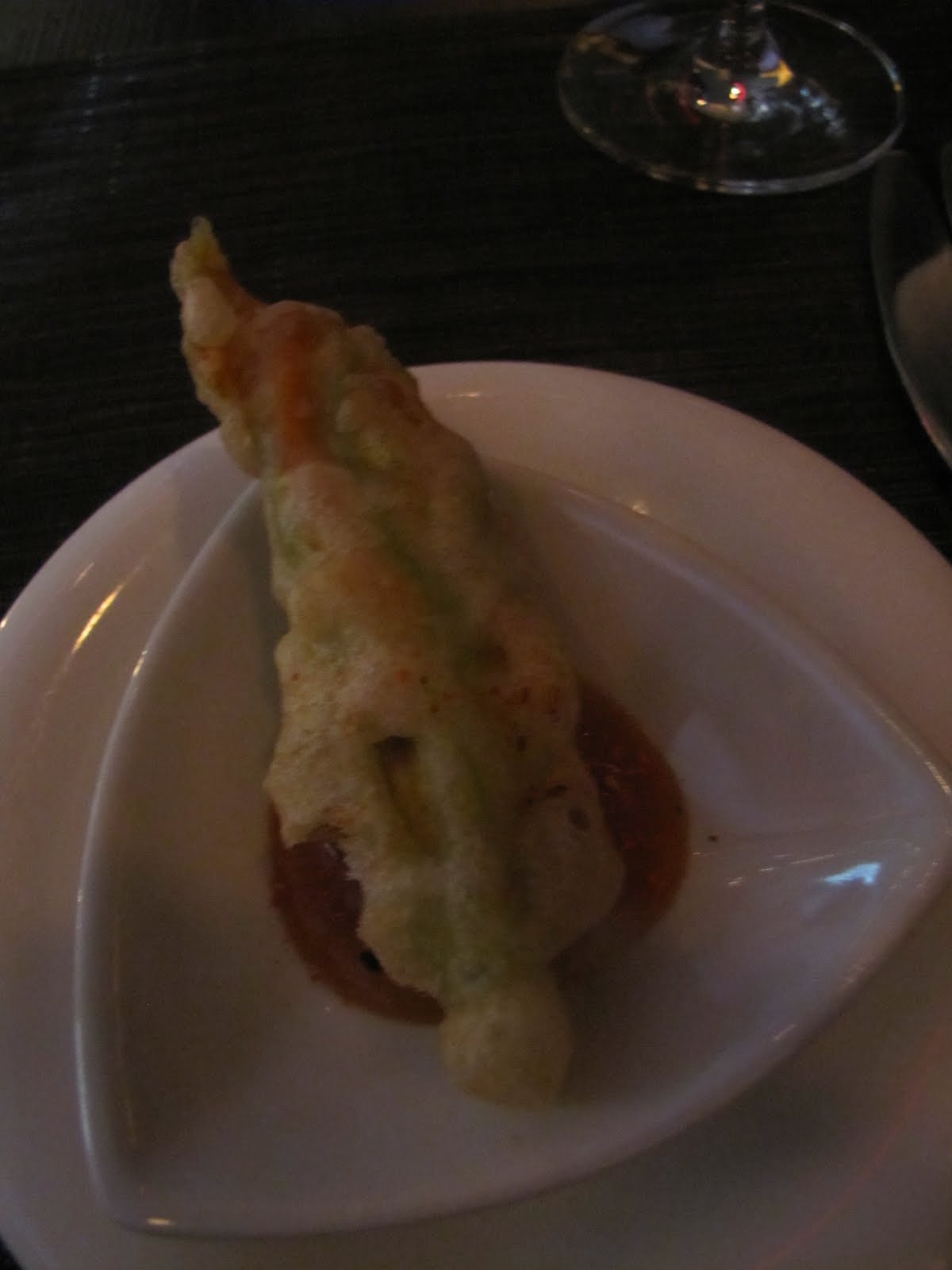 We began our culinary journey last night with an Amuse Bouche of Squash Blossoms, stuffed with a Crab Rangoon type of filling, deep fried and served with duck sauce. I have always had a love of squash blossoms and remember them to be one of my mothers favorites as well. Because of this, I have associated them with primarily Italian cooking, and was excited to try them in a more Asian inspired creation. I have to say- those squash blossoms are good no matter what! The Crab Rangoon filling was rich with creamy cheese, and had just a hint of spice that was so nicely mellowed with the sweet plum sauce. The blossoms themselves were perfectly fried to crispy deliciousness. The batter used resulted in a crust that was light and airy enough to not over power the delicate nature of the flower, but simply added a wonderful texture variation.