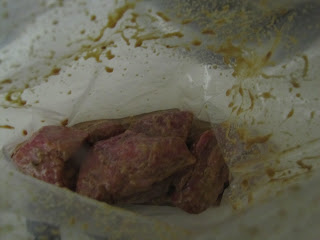 When I arrived back home- I was VERY glad I had chosen such an easy meal- it was very nice to catch up with Paul. As we chatted in the kitchen, I threw together a quick refrigerator marinade (basically of anything I could find in my fridge) of Dijon mustard, Worcestershire sauce, steak sauce, a little salt, and pepper. I love making marinades this way- it uses up ingredients, it's fun to flavor combine, and it doesn't take much thought. Perfect. I added the marinade to a large Ziploc bag, and then added the steak tips, sealed the bag and shook it til each piece was nicely coated. I wanted them to marinate just a bit, so I started on the Quinoa.