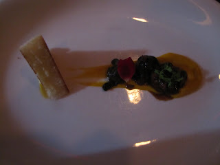 Our next course was a Fricassee of Escargot with pureed carrots, mushrooms, lardons and a healthy wedge of brioche. This was my first time having Escargot in a non traditional preparation. Whenever I've had them in the past they have been served with plenty of garlic and butter. Here they were paired with much different flavors with a rich and velvety carrot puree that was so beautifully sweet and was gorgeous with the robust escargot. I have to point out the beauty of the presentation of this dish as well, as you can see the photo- it was the little touches not forgotten here, and the chef dressed up what could have been a rather monochromatic dish with a gorgeous single flower petal. The contrast was striking.