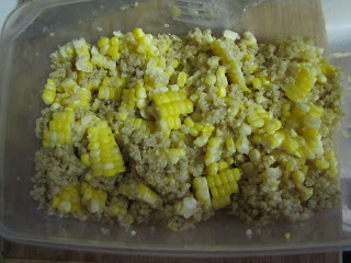 time. When I felt it was about "that time" I removed the corn from its ears, then I chopped up some veggies (cucumber, red onion, sugar snap peas) and a small handful of parsley, and placed them in a large container. I added a few handfuls of baby arugula, and several heaping spoonfuls of the Quinoa. I also added a generous crumble of Ricotta Salata- which may be one of my very favorite cheeses in salads.