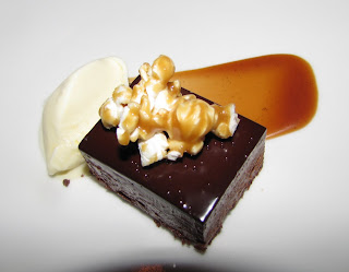 Of course, I wasn't at all disappointed in the dessert which was a dark chocolate Marquis cake served with buttery popcorn flavored ice cream and a decadent caramel sauce. Oh that cake- a beautiful combination of mousse and cake and glaze...incredibly decadent and rich but absolutely amazing with each layer of cake a different texture. The relief of the ice cream was perfect, though unfortunately my palate didn't pick up on the idea of buttered popcorn from the flavor, but rather a end note nuttiness. Either way- it was delicious. Finally, the addition of caramel was perfect, and tied the whole dish together, especially with a gorgeous piece of caramel corn sitting atop the chocolate cake. The presentation was beautiful and the dish was delicious. The perfect end to the meal.