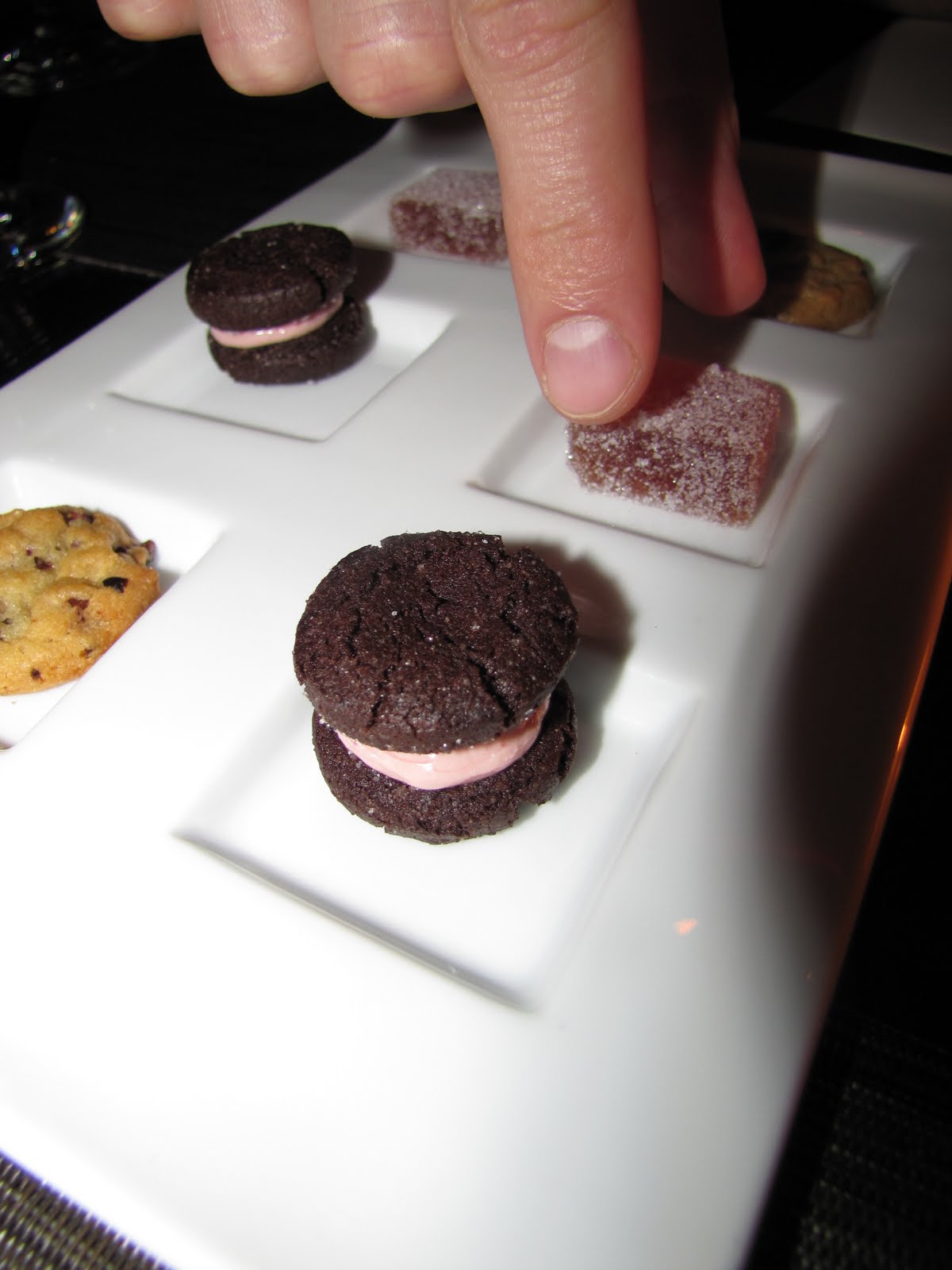 Of course once we thought we were done, they sent out beautiful cookies as well. I stole just one- a chocolate sandwich cookie with a raspberry cream inside. Perfectly executed.
