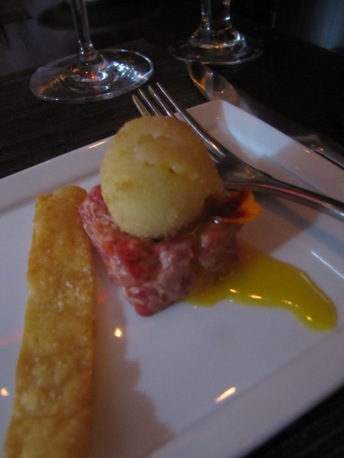 We then moved on to a roasted Jalapeno Beef Tartare that was topped with a beautifully crisped quail egg, with a black bean, corn and Poblano pepper jam. Beef Tartare is one of those wonderful dishes to me, that just screams decadence. The beef chopped finely and combined with the different spices and oils results in a creamy consistency, and when combined with a beautifully runny egg yolk...just delicious and ever so creamy. The jam was lovely as well, warm flavors, roasted to a gorgeous smokey flavor with an ever so slight background of sweetness to round it all out. This dish was perfection, with exact flavors, textural intricacies and visual intrigue.