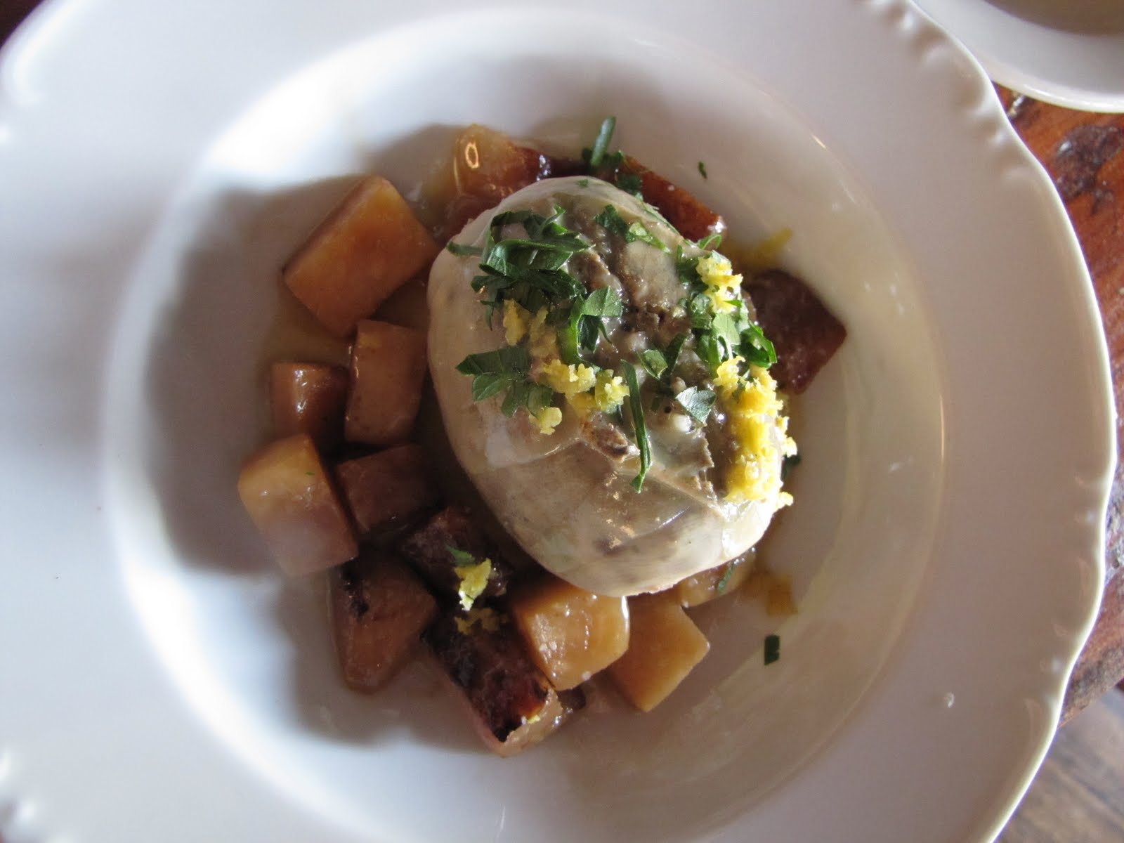 We decided to start off, at the recommendation of Jason, with their Haggis and Neeps. Here I'll be honest- I have never had Haggis and Neeps. The dish may have been a bit too adventurous for me when I was living in the UK, as the Haggis typically features chopped heart, liver and lungs from a sheep, mixed with seasonings and minced onions and then stuffed into the intestine of the sheep and cooked that way. Last night though, as my palate has expanded 10 fold since college, I thought it was a wonderful way to kick things off at The Haven. Their version was actually Lamb based, and was served with accompanying kohlrabi (a type of turnip), and a Drambuie butter sauce. Drambuie is a Scottish liquor of honey and herbs. The presentation was absolutely gorgeous- the plump "sausage" sitting in the middle of a beautiful bowl of neeps, accented with lemon zest and chopped parsley. Again- I have never had Haggis before so I wasn't sure what to expect, but the inside was surprisingly un scary- the internal lamb resembled ground beef, and was very lightly seasoned. I almost missed the lack of salt (darn American palate) but then realized that when combined with the lovely lemon zest or the butter sauce, or even the pickled vegetables and fruits that were served all the flavors came together in perfect harmony. Lovely.
