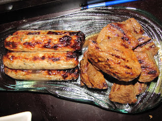 With that out of the way, and two hungry guys on my hands- I immediately started the steak tips and the chicken sausage. Normally, I would have liked to have used the grill pan for both, but decided to broil the sausage in the oven while the steak tips cooked in the grill pan. I think I might always cook it that way- the "sausages" got that great blistered look to them as they do on the grill, so they just looked like summer. When the steak tips were done in the grill pan, a simple plating for everyone to serve themselves and we were ready to dine.