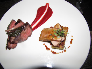 polenta cake, stewed olives and tomatoes, pickled ramps and a beautiful smear of Harissa. The pork had been dressed with a dry rub that gave the pork a really lovely flavor that somehow reminded me of Christmas Ham. The steak....oh the steak. Perfectly cooked, well seasoned....amazing. I loved the accompaniments as well, though I felt to some degree that the olives over powered the tomatoes a bit which was a bit disappointing. I happen to love olives though, so it wasn't really so bad :-). The Harissa was also delicious, though sweeter than it was spicy. Again though, the flavor was amazing and after the Bass dish, I didn't miss the heat.