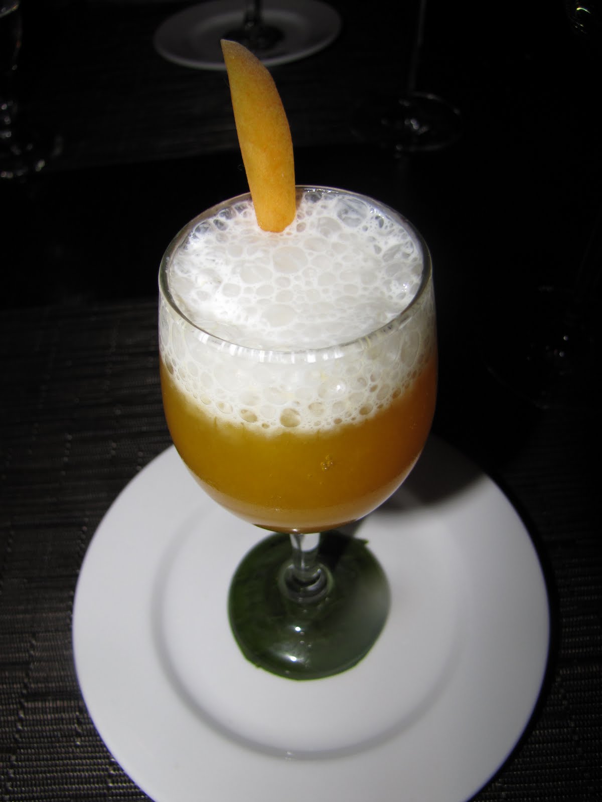 Just in time for a quick break, the chef served us a little palate cleanser of Apricot soda with an Yuzu-Mint creme fraiche foam. This looked beautiful, and did a perfect job of gearing up our taste buds for the next course. The soda itself was slightly bitter, but when combined with the foam it was a rounded taste. Beyond that, it looked like a perfect fountain drink with the foam- it made me long for my days of scooping ice cream -trying to achieve foam like that!
