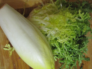Endive comes in a few different forms- Belgian which is long and pale in color, but I love to used either chopped up in salads, or as a little vehicle of all types of fillers and salads making them finger foods. I love to fill the whole leaves of this variety with a seafood salad for a party- always an elegant presentation, and easy clean up :-). Curly Endive, also known as Frisee, is a but more "scratchy" than types of leafy vegetables, but when added in small clumps to salads they provide a bitter bite like no other.