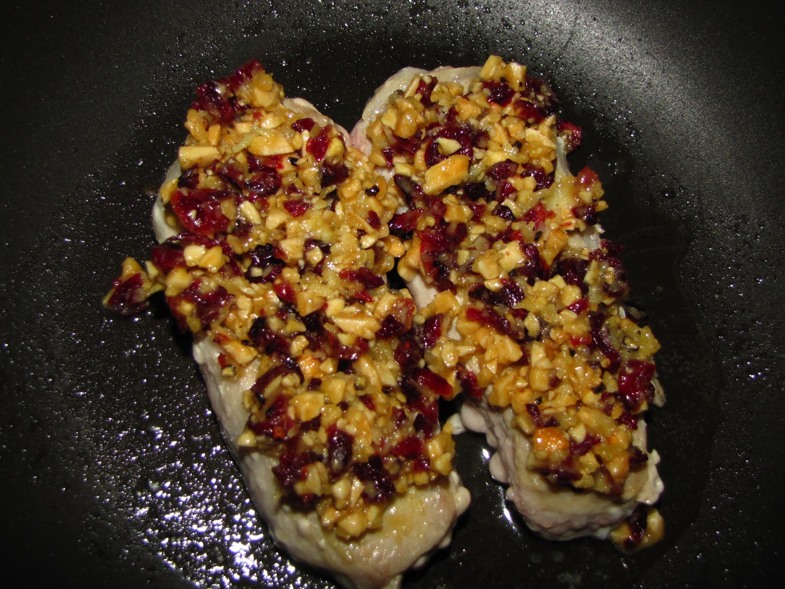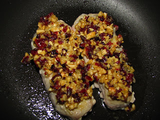 The pork chops came out of the oven and were really pretty looking. The red from the cranberries with the cream from the almonds was really lovely looking. This was one of those dinners that I really wondered about when I was making it. In my head, it sounded interesting and fun, but I had a little doubt about it's end product. Once tasting it a few times- I really loved this! The Dijon mustard combined with the fresh black pepper provided a really healthy kick to to the topping, but it was immediately soothed by the sweat tart nature of the cranberries, and even the sharp cheddar. I did enjoy that the crumble didn't encase the chops as well- as it ended up being a nice relief from the strong flavors.