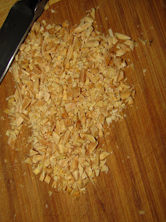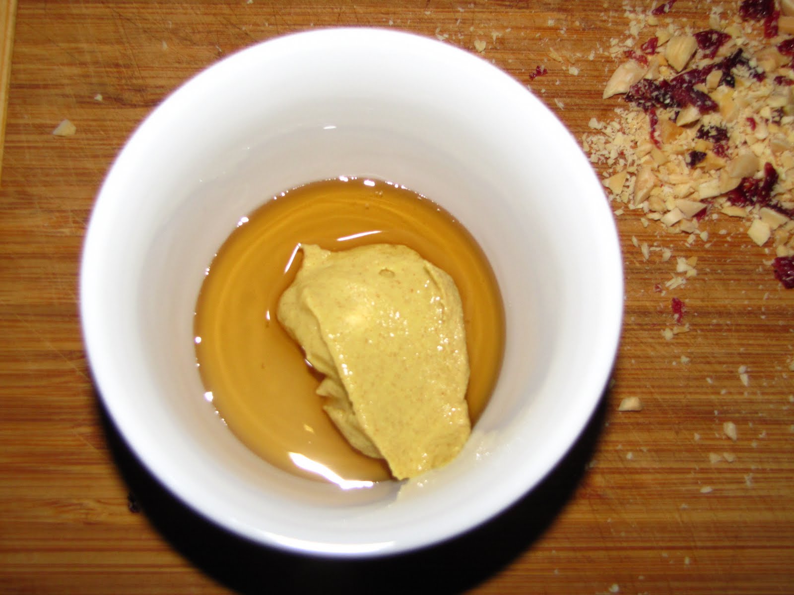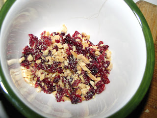 I started by chopping some slivered almonds into small pieces, and then doing the same with some dried cranberries. In a small bowl I combined a tablespoon and a half of Dijon mustard, and a teaspoon-give or take of maple syrup. My advice here- add the syrup slowly-I wanted the crumble to have a maple flavor but not be super sweet. So combine and taste as you go. Once I had a nice flavor to the binder, I added just a pinch of salt, and a turn or two of fresh ground pepper, then I folded in the chopped almonds and cranberries so they were lightly covered with the maple Dijon dressing. I also added just a tablespoon of shredded cheddar cheese.