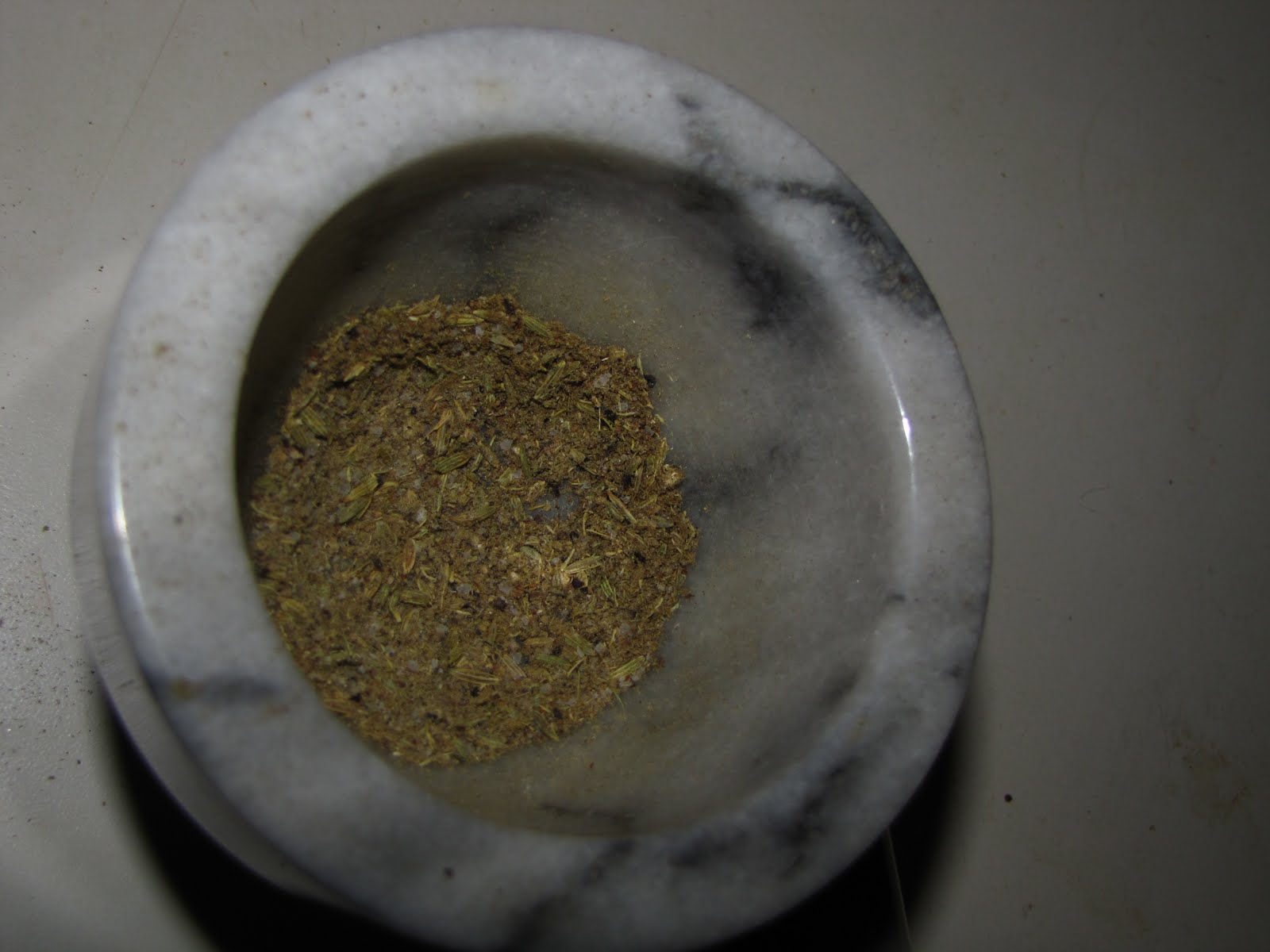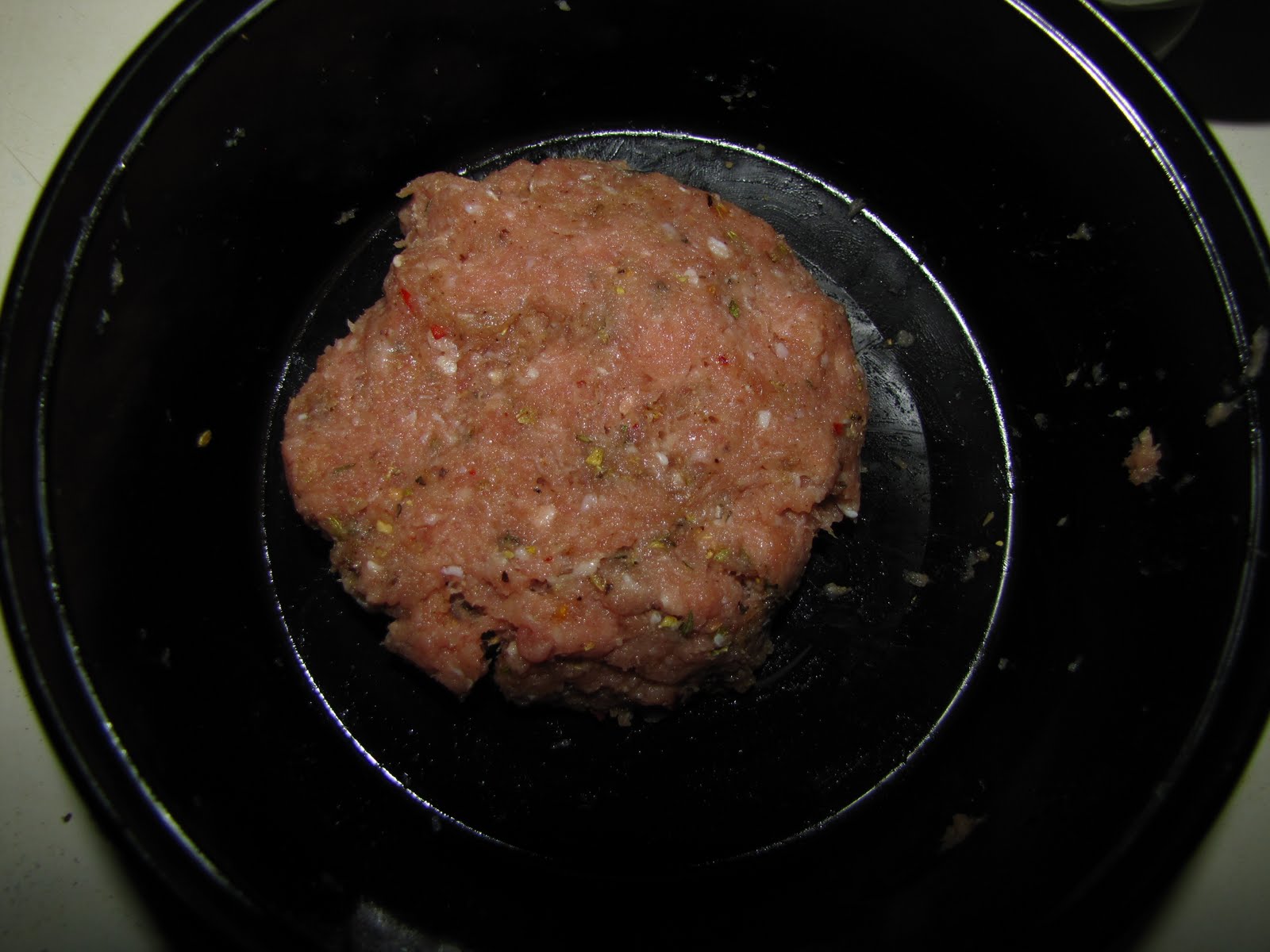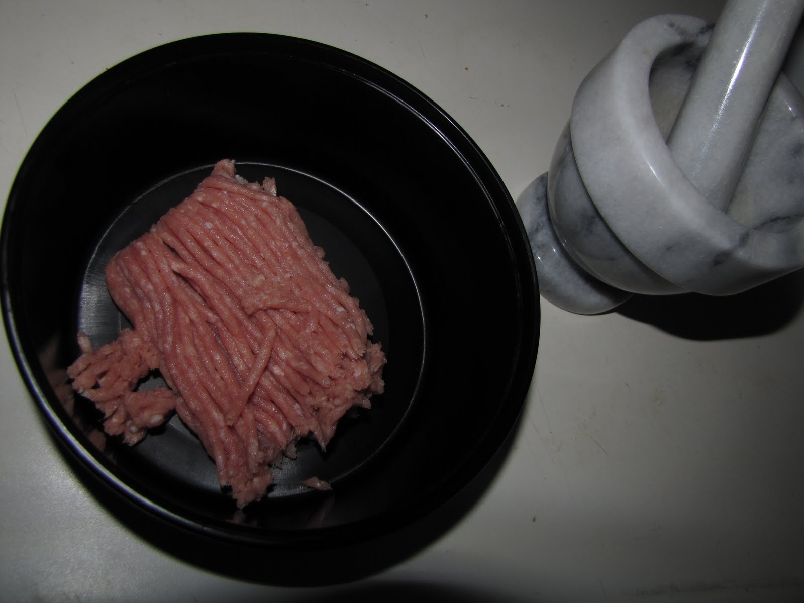 I started by taking out my mortar and pestle- I feel like anything I make with that thing has to be fun, and a 1/4 lb of 94% lean ground turkey meat. In the pestle I combined about a 1/2 teaspoon fennel seeds, about the same of ground sage, crushed red pepper flakes (to your liking), dried Italian herb blend (as much as it kills me to own it), a little sprinkle of salt and fresh ground black pepper, and a little shake of nutmeg.