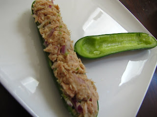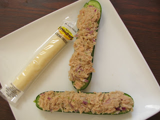 Taking my cues from Ants on a Log, I decided it would be fun to make something as fun to eat, and perhaps a bit more nutritious. I settled on Tuna Boats. Through speaking with the mothers who attended the lunch, it appears that cucumbers have become a popular snack for kids, and since they are delicious, and refreshing (though a bit low on the nutritional scale) I thought that I would use them as my base for my boats. I found petite sized cucumbers in my grocery store, I know these are also readily available at Stop & Shop, and sliced one in half the long way, revealing the perfect rows of seeds. Now, what good are those seeds in a boat? I took a melon baller from my utensil tray and just removed those right away. In their place? I piled high a lovely tuna salad, and viola- Tuna Boats were ready to set sail!