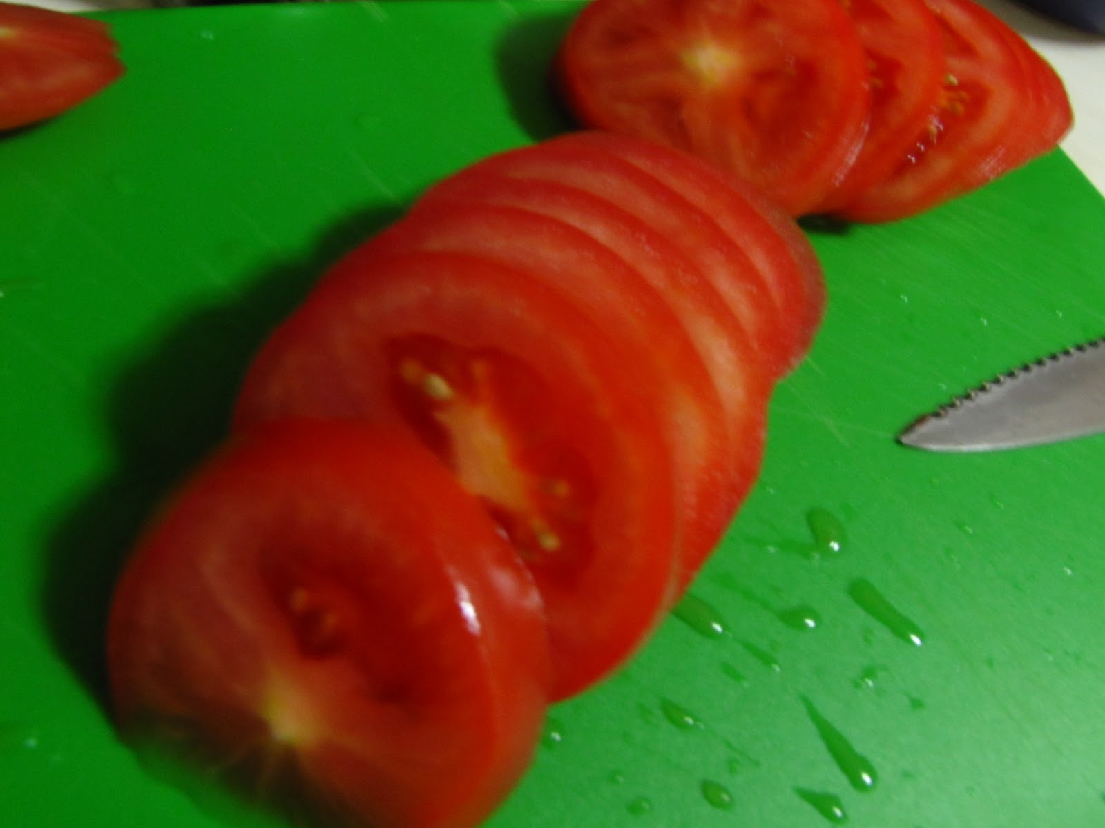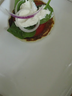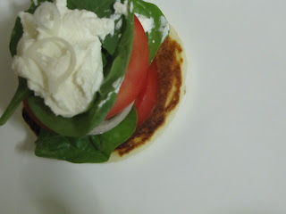 When the pancakes are cooled, place one on a plate, and then layer a slice of tomato, several leaves of spinach, and a tablespoon of ricotta on top. Sprinkle with onion slices, and then repeat the stack leaving out the initial pancake. The result should be Pancake, tomato, spinach, ricotta, onion, tomato, spinach, ricotta, onion.