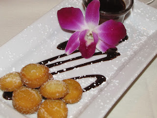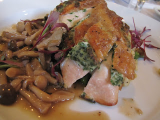 We waited a long time for our entrees, which were finally ordered once our server made it back to our table, and when they were delivered, we found that we were utensil less, and then found it impossible to flag down any of the waitstaff to request more. After debating for a bit, we snagged some off the unoccupied table next to ours. Frustration. I had selected their Grilled Dayboat Scallops as an entree. These were served with spinach, papayas and avocados, and potatoes all in a sweet corn broth. The list of ingredients screamed summer to me, perfect for a rainy and cold June evening. Starting with the good- the corn broth was perfect. Bursting with fresh corn flavor it was a wonderful tribute. It absolutely brought the ideas of hot summer nights to the forefront. The papaya and the avocado were both well ripened and added sweetness and decadence to the dish. The scallops, however, were severely over cooked. Each had taken on the texture and mouth feel of rubber, making them unappetizing. The potatoes were missing, aside from one, from my plate. Conceptually, this was a great dish, it just failed in execution.