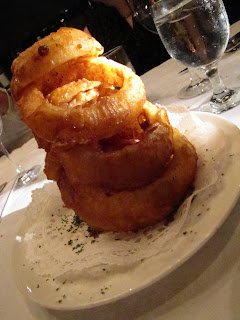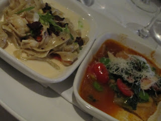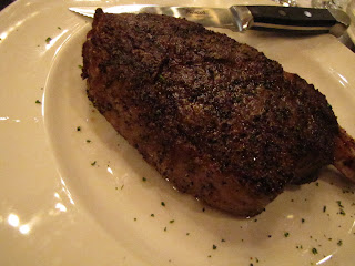 Our entrees were served in perfect timing to our first course plates being cleared- a few moments of rest between the two. The selection for the evening was a wood grilled sirloin topped with bacon jam, served over Parmesan grits, and complimented with a fennel and fresh peach slaw. The sirloin, tender to the bite, was served a perfect medium rare, with pure and clean beef flavor ringing through. The bacon jam was smoky and delicious, and I swear I detected light flavors of cherry as well- which was absolutely wonderful. I loved the use of grits with this dish. They were cheesy and delicious, and their slightly grainy texture really made them stand out from a typical "potato" or "polenta" side. Finally, the slaw was the most unique component- fennel and peaches dressed with an Asian inspired sauce. Had I known that it would have an Asian feel to it, I probably would have doubted it's addition on the plate. The rest of the dish seemed almost down home, and Southern, this slaw would have seemed out of place. However, in it's application, it was light and refreshing, and a perfect compliment to the rest of the meal. The light soy and ginger flavors lent brightness to an otherwise heavy dish.