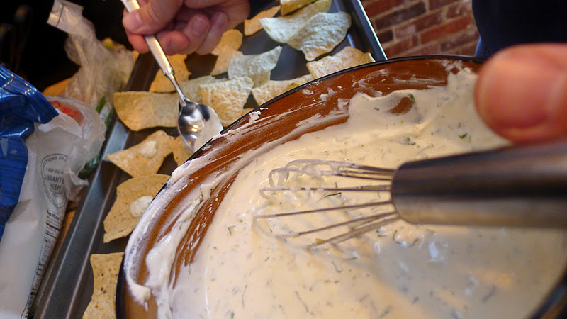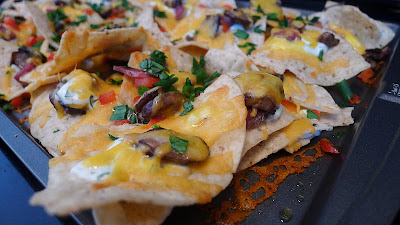After a fair amount of discussion and planning, the ingredients became less and less similar to "ordinary" nachos.  Goat cheese, lemon zest, parsley, cheddar cheese, red bell pepper, mushrooms, and green onions found their way on to regular, salty corn chips, and our nachos were born.