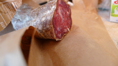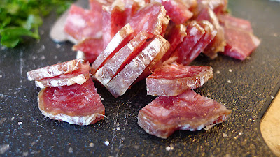 Of course, these weren't any ordinary nachos we made.  It all started with a purchase of Wild Boar Salame.  Wild Boar has a really unique taste to it, strongly influenced by the boars diet of grasses, roots, and berries. It is stronger than your average pig flavor, and is also a fair amount leaner.  The salame is often made by combining this boar meat with pork to add some fat to it.  The flavor is rich and intense, with deep flavors.  Wild Boar Salame in hand, it was time to imagine the rest of the nacho ingredients.
