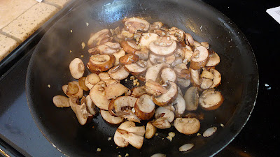In a skillet over medium heat, drizzle 1 tbsp of olive oil, add 3 cloves of chopped garlic.  Once the garlic begins to smell, add the mushrooms and saute until cooked.