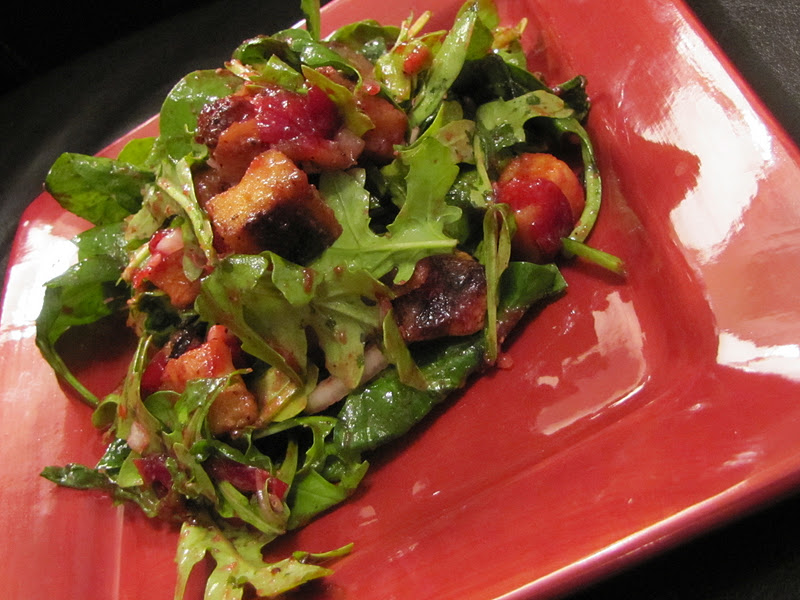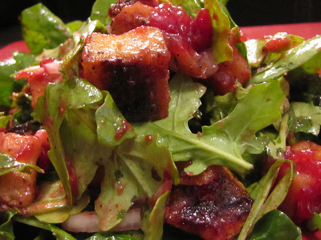 Combine the greens, onion, and roasted veggies in a large bowl and toss with the cranberry vinaigrette. Serve.