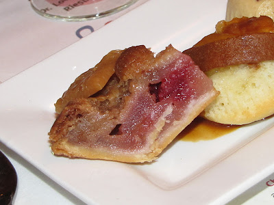 We began our journey with an Apple Cranberry Pie, paired with a Banylus, a red French dessert wine.  The combination of sweet apples and tart berries was a lovely mix, and the pie was cooked well throughout, however it didn't shine out to me as a stellar pie.  However, my mom makes the best apple pie so its entirely possible I'm a bit bias.  The wine pairing however was really lovely.  The Banylus was rich and sweet without being overpowering and when sipped just before a bite of the pie, I found stronger notes of cinnamon and spice from the dessert.