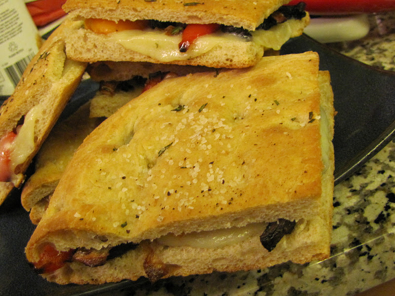 After the bread had cooled, I cut it into squares  (approximately 4" x 4") and then stuffed them with roasted Portobello mushrooms, roasted red and orange bell peppers and a slice of Provolone cheese.  I baked them off for 10 minutes or so, until the cheese had fully melted, and then devoured.