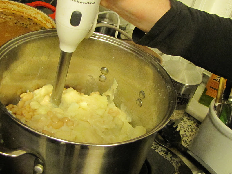 I alerted Dan that I'd be pilfering his idea, though I promised to change it up.  His included that little bit of heaven ingredient- roasted garlic, a combination I knew had to be delicious.  I took a bit of a left turn though and decided to draw some inspiration from the idea of Potato Skins, a classic sports accompaniment in my mind, and topped my bowl of steaming hot soup with cheddar cheese, scallions and bacon (mmmm bacon).  I always believe it is ridiculous to talk about "lightening" something up when I've just discussed bacon, but I did want to make the note that I decided against using cream in this soup to achieve the "creamy" flavor of mashed potatoes.  Instead, I depended on my old friend the Cannelloni Bean,which, when whipped into submission, provides a wonderful cream like flavor/texture that I truly adore.