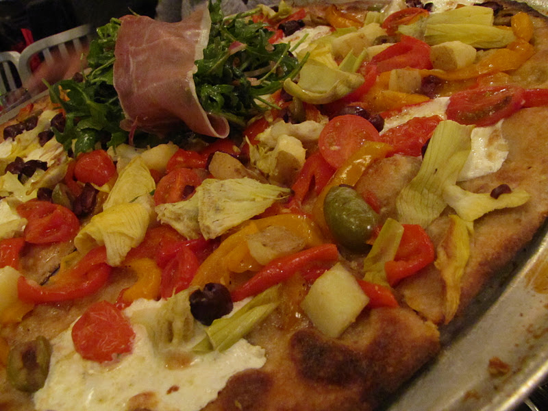 We were also treated to a selection of their appetizers.  Now normally I find appetizers at pizza places to be, well, pretty terrible.  Cold sticks of fried cheese, maybe a sorry stack of nachos...what is it with cheesy appetizers before eating cheesy pizza?  Well Stone Hearth has changed all that. Their appetizers consist of a creamy eggplant dip, mild or spicy plump meatballs or fresh salty olives wrapped in cheddar cheese and then baked into a toasty treat.  These were not your average pizza joint offerings, and it was clear that thought and time went into each.