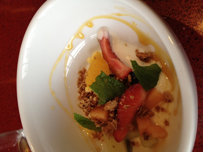 That aside, there was the food. Most likely based on our extreme staring for over an hour, Chef sent over some breakfast parfaits to get us started. Homemade cinnamon granola was paired with tangy yogurt, fresh cut up melon and berries, a drizzle of honey and a few torn leaves of mint. Simple as this parfait was, it combined a delicious mix of textures and flavors, ranging from the warming comfort of cinnamon, to the bright flavors of fresh fruit and refreshing mint.