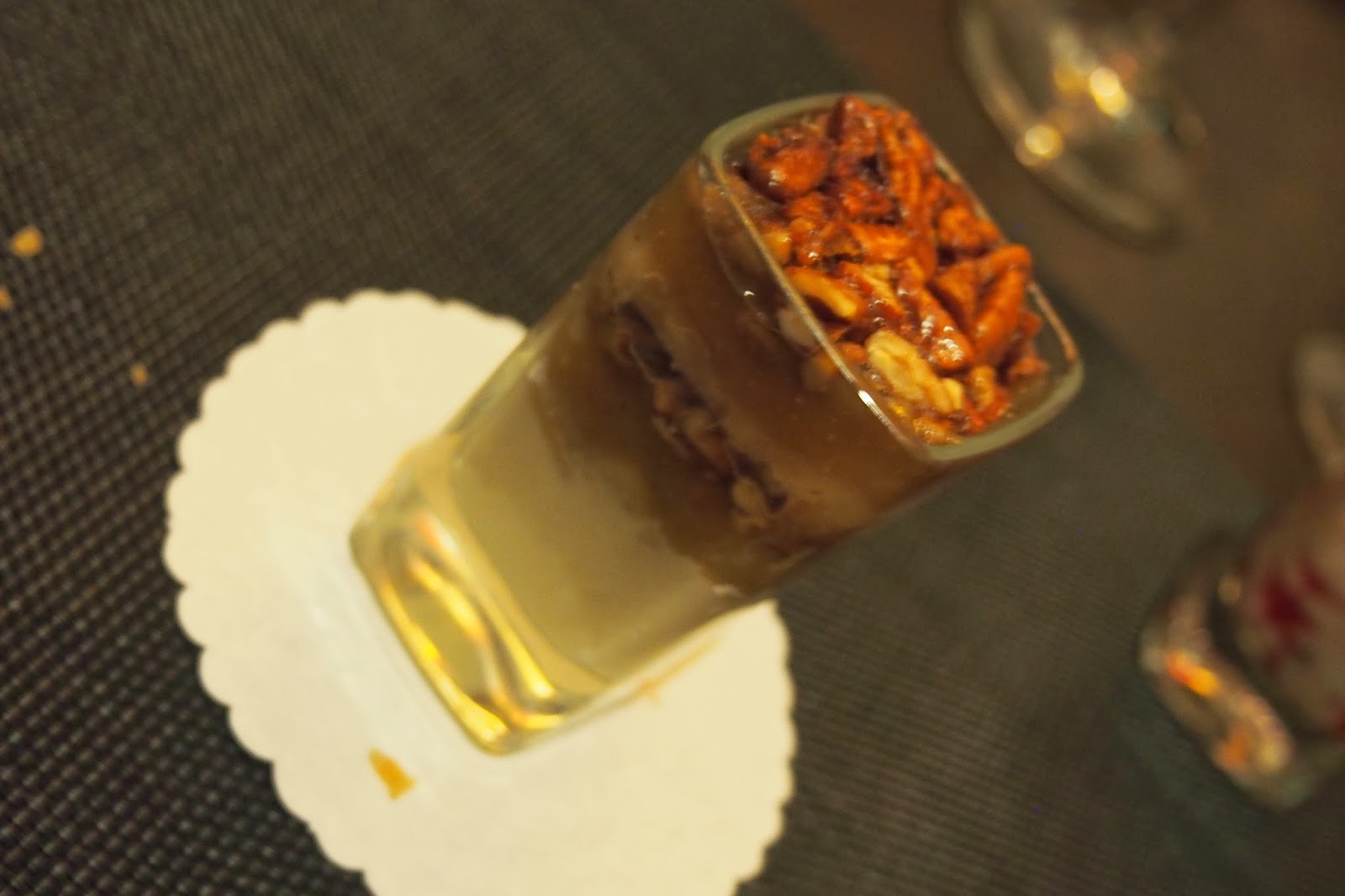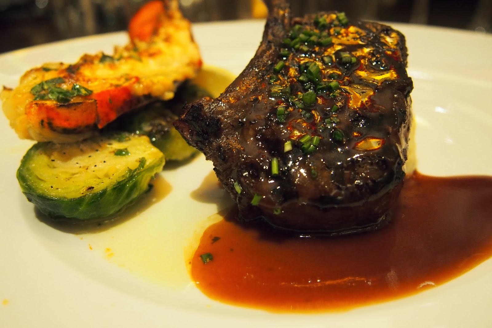 Our final savory course didn't hold any punches, bringing surf and turf to a whole new level. Here we had an oak grilled lobster tail with a New Zealand venison chop. These were paired with roasted brussel sprouts, truffle mashed potatoes and a red wine demi glace. Can we talk just for a moment about Lobster....and Venison? This is a delightful pairing. The lobster simply grilled with clean natural flavor, and the venison with a bold meaty flavor, offset nicely with the demi glace. It was a gorgeous pairing of flavors. Also, it must be said- those were some deliciously roasted brussel sprouts.