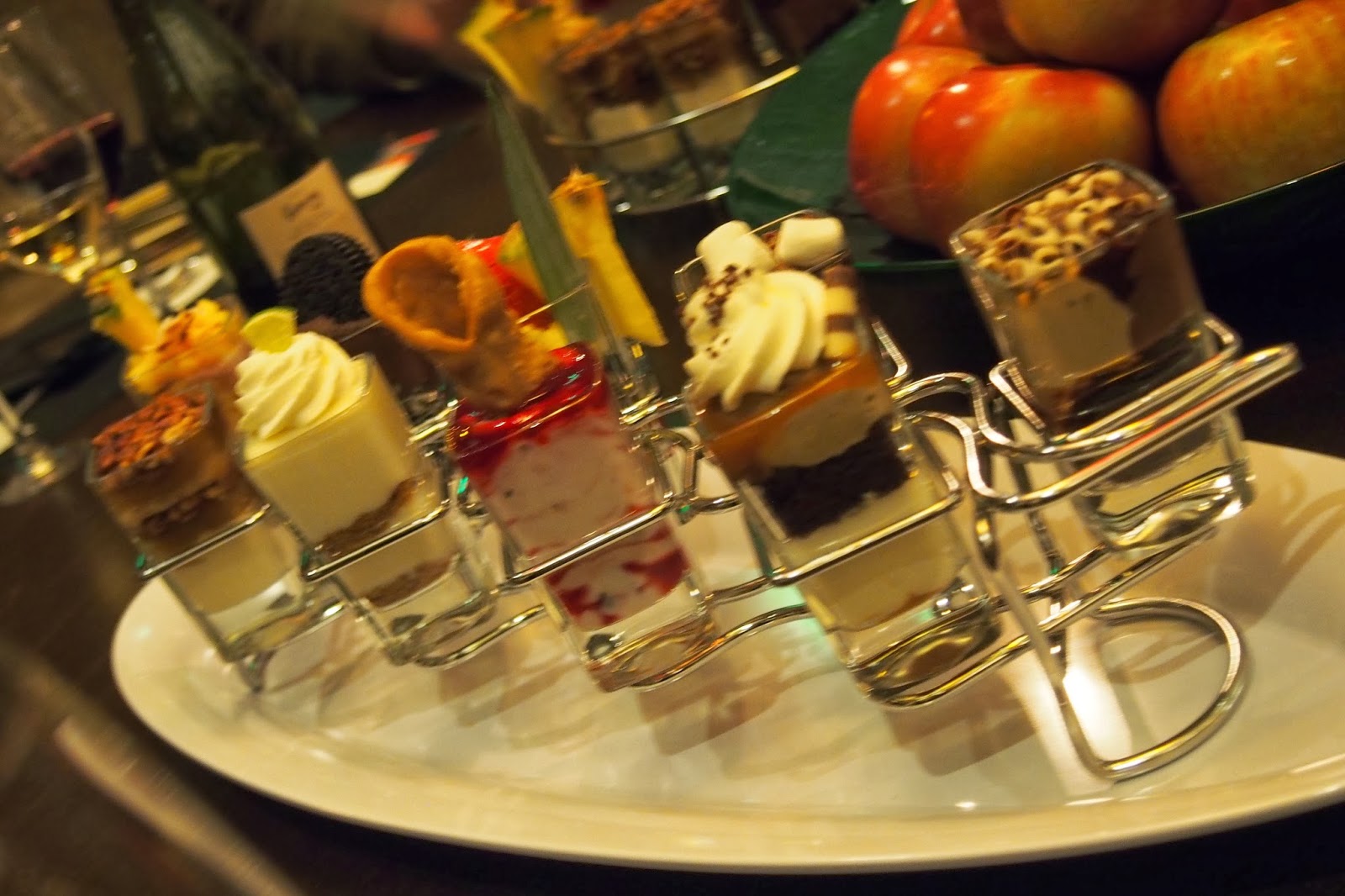 Desserts. Every table receives a selection of these to pick from, and I would urge you to try several. Current fall selections include Chocolate Peanut Butter Mousse, Key Lime Pie, Mocha Macchiato, Pecan Pie with Vanilla Mousse, Pumpkin Pie with Ginger Snap Crust, Belgian Chocolate Rocky Road, Raspberry Chocolate Chip Cannoli and Market Fresh Fruit.I indulged in two of these (to my defense they are small) and chose the Raspberry Chocolate Chip Cannoli, which combined creamy ricotta cheese with a raspberry sauce, and chocolate chips, and then out of the top sat a mini cannoli shell. My second pick was the Pecan Pie with Vanilla Mousse which presented layers of sticky, gooey pecan pie filling with vanilla bean mousse. Both desserts presented a wonderful combination of textures and were just decadent to make you feel as though you had indulged, just on a small scale.