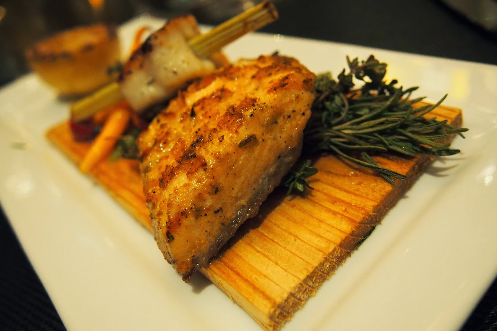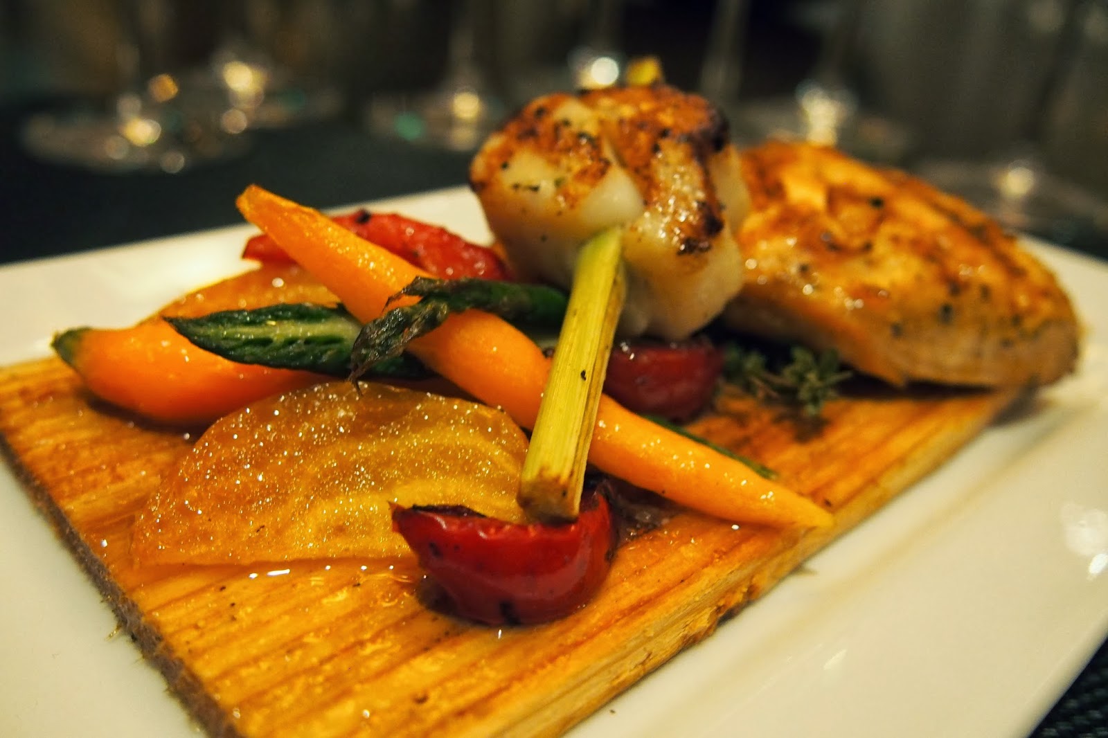 Our first course was then placed in front of us organic salmon that had been roasted on a cedar plank, served with a scallop speared with lemon grass, and served with roasted winter vegetables. The salmon was cooked to perfection and had been roasted with a selection