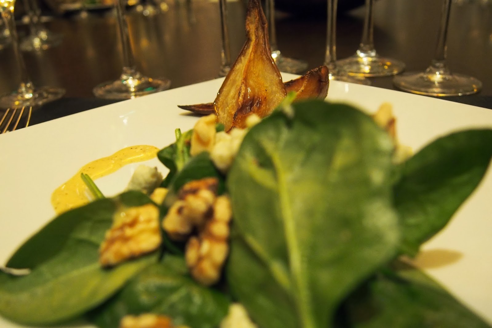 Our salad course was presented next, featuring a baby spinach salad, enhanced with Gorgonzola cheese, walnuts and caramelized Bosc pears. The stand out piece of this salad, which was overall incredibly clean and fresh with a classic combination of flavors, were the pears. Chef explained that the "caramelizing" happened simply, by just roasting them, unadorned, in the oven until their natural sugars warmed and caramelized naturally. These were delicious- warm and sweet, but without anything heavy making them guilt inducing, they provided all of the comfort of a decadent salad.