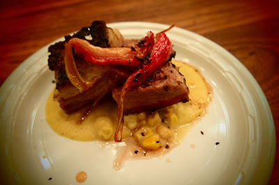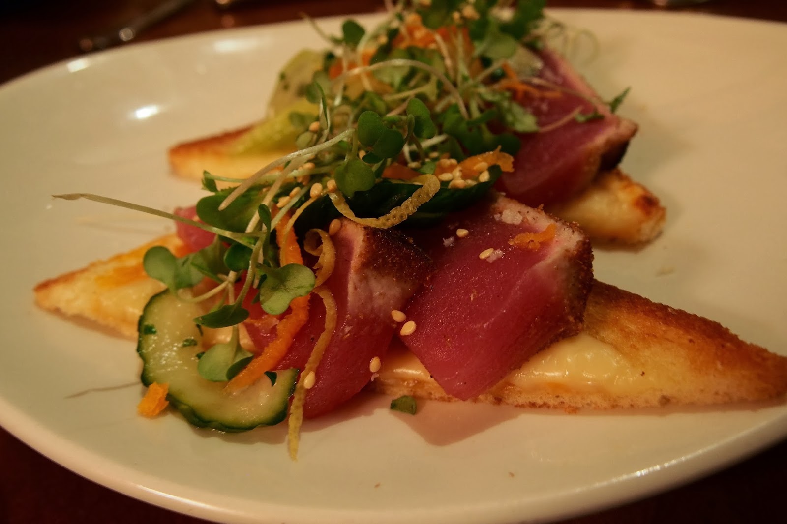 ever classic "Tuna Melt" twisted with inspiration from the East and West from Alchemy and Grilled Moroccan Spiced Tuna from Union.I started with the Inspired Tuna Melt which layered coriander crusted Tataki Style Ahi Tuna over melted American Cheese on top of a toasted slice of Portuguese Sweet Bread. Enhanced with Bread and Butter pickled celery, crisp cucumber, Sriracha Garlic Aioli, and a little wasabi this was the best tuna melt I've ever had. The bright flavors from the pickled vegetables with the spice of the Sriracha and wasabi and then blended with the classic saltiness of melted American Cheese made this a really unique taste on a pretty stereotypical food. I did find it to be a bit overly salty at times, but overall the concept was fantastic.