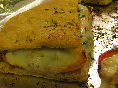 After the bread had cooled, I cut it into squares  (approximately 4" x 4") and then stuffed them with roasted Portobello mushrooms, roasted red and orange bell peppers and a slice of Provolone cheese.  I baked them off for 10 minutes or so, until the cheese had fully melted, and then devoured.