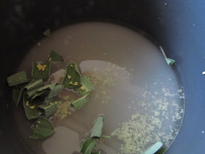 Back in my kitchen I began the soup by cutting the kernels off of two ears of corn, and then cutting down the cobs into pieces that would fit in a small sauce pan, covered them with water and set them a-boiling.  In a large skillet pan I melted a tablespoon of butter over low heat and then added 4 thinly sliced garlic cloves, and a tablespoon of chopped fresh parsley, salt and pepper.  When the garlic had softened, I added the corn kernels, and a teaspoon more of butter.  At this stage, I wanted to keep a fair amount of liquid in the pan and over a low enough heat where the corn kernels would cook, but not fry or crisp.  Once the butter had melted, I added 2 tablespoons or so of the beer, and raised the heat to a low medium.  I covered it, and let it saute.  A few minutes later, I gave the corn a good stir, and added more beer, and then covered again.  I repeated this until about half the beer had been used, and then kept it covered and over the heat until the alcohol had burned off.
