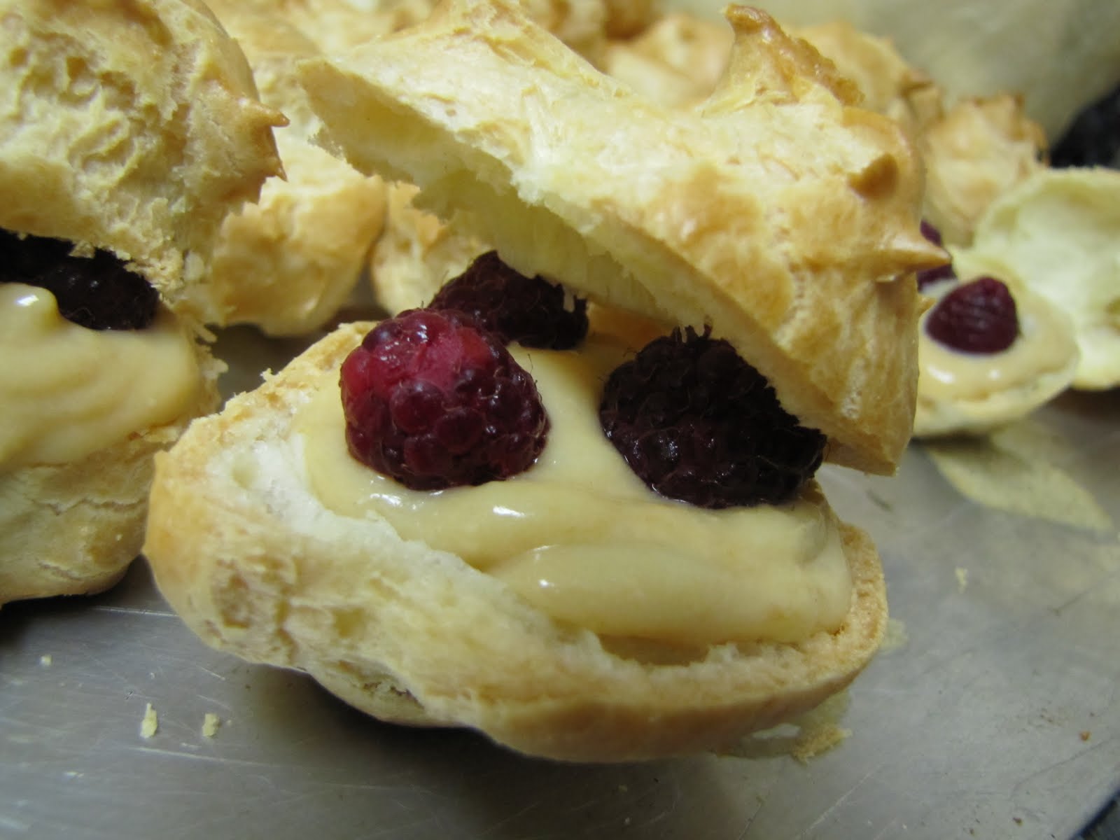 These were rather addictive to be honest.  Each one puffed up and made beautiful towers of pastry, but when sliced into were pleasantly cavernous allowing for maximum amounts of Creme Patisserie to be piped in.  I topped each with fresh raspberries and enjoyed every heavenly bite!