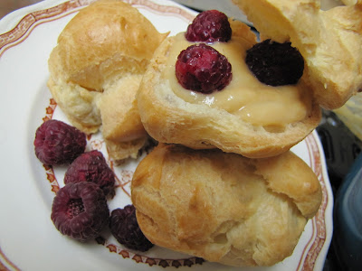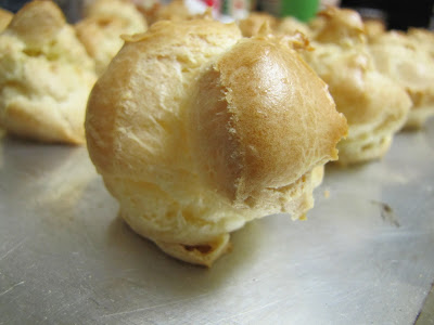 I love cream puffs- I love the subtle yet buttery flavor of the dough, I love how light and airy they are, I love that they are stuffed with cream filling.  Most of all, I love that they feel like little clouds when you bite into them.  A slight crisp on the outside gives way easily, like a bubble being popped, to the sweet whipped cream like filling.  They are just delicious pieces of heaven.  I have always assumed that they are difficult to make- that to achieve the proper puff, the eggy nature of the interior....I thought all of that spelled out hard to make.   However, what I found was quite the opposite- they were easy as pie to make- from the fluffy little shells to the Creme Patisserie I used from the expert on all things French- Julia Child.